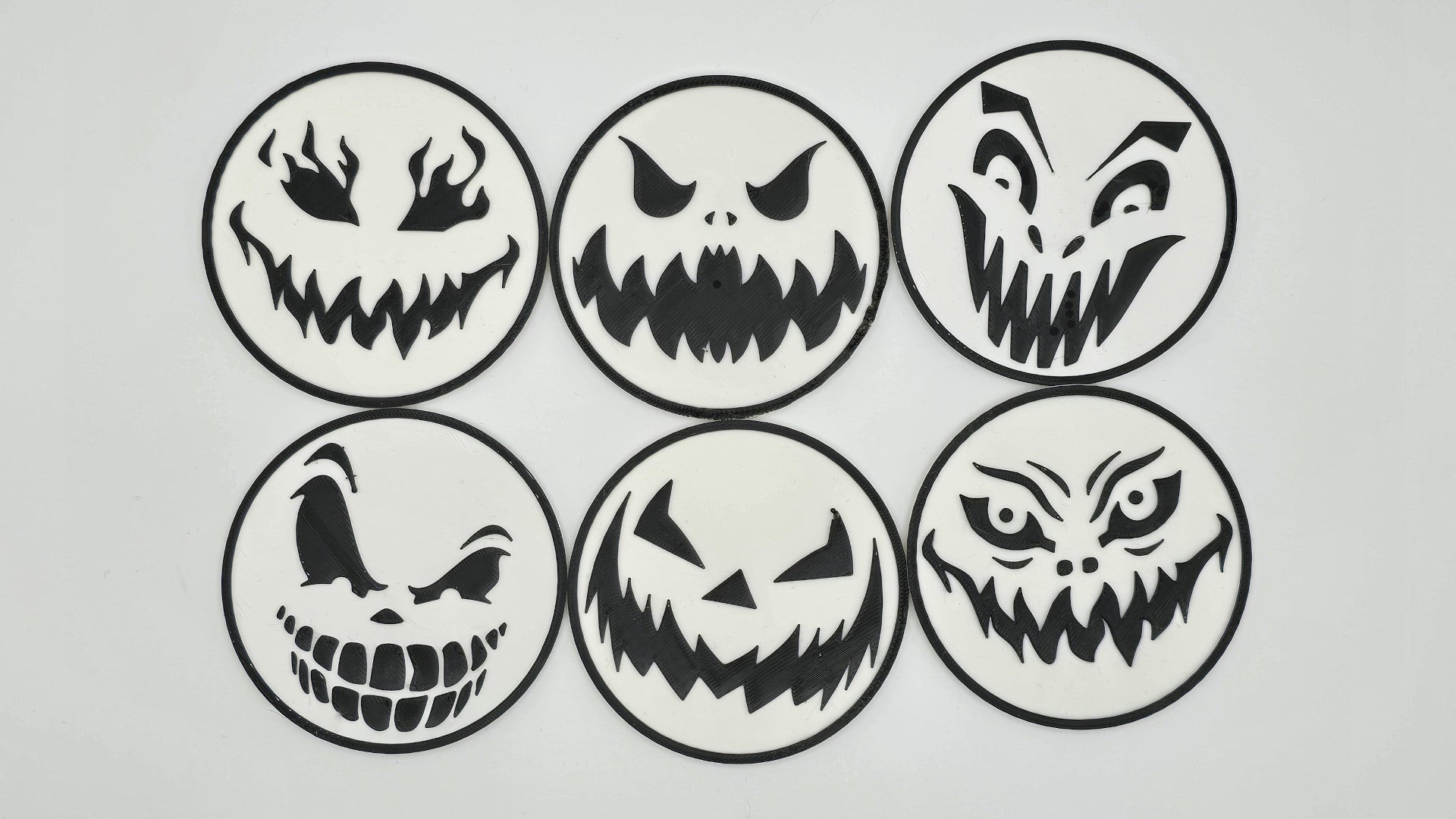 Add a touch of spooky charm to your Halloween décor with this set of 6 Halloween-themed coasters! Each coaster features a unique, eerie face, from grinning pumpkins to ghostly ghouls, perfect for setting the mood at your next Halloween gathering. Made from durable, eco-friendly PLA material, these coasters are lightweight yet sturdy, ensuring your surfaces stay protected from spills and heat. Their smooth finish and vibrant details make them a fun and practical addition to your festive setup. Whether you're hosting a haunted party or just embracing the spooky season, these coasters are a must-have!